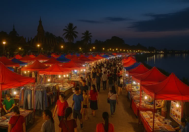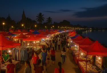 A lively evening market along the Mekong River. Enjoy local food, handmade goods, and a peaceful riverside atmosphere.