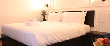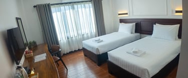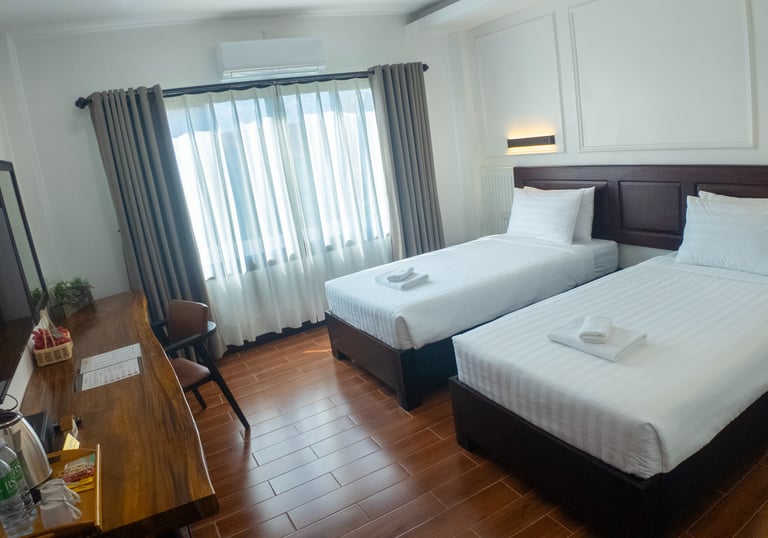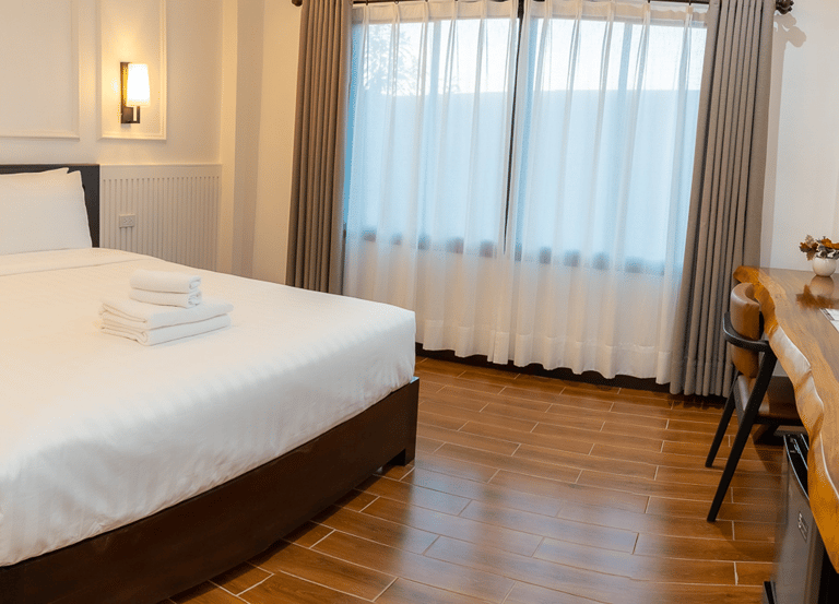 Perfect for friends or family, our Twin Room offers two separate single beds with stylish wooden décor. The room ensures comfort and privacy for a restful night’s sleep.