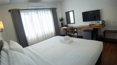 Our Standard Room is a warm and inviting space designed with elegant wooden décor. It is perfect for solo travelers or couples seeking a peaceful place to rest after a day in Vientiane. Each room includes a soft bed, air conditioning, a private bathroom, and all essential amenities for a pleasant stay.